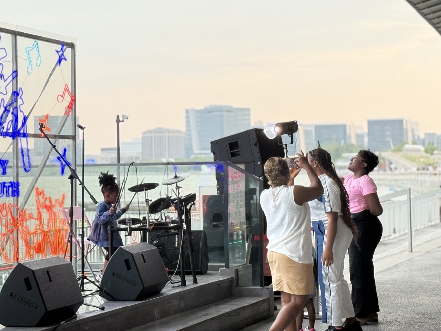 这个长假,在一号码头旁,南汇新城镇举办的滴水湖全民唱享活动全天候常态化开展,也为节日氛围增添几分热闹。这个“没有门槛的舞台”上,市民游客轮番登台,有小朋友唱儿歌,有年轻人唱流行曲,还有老人唱经典红歌,台下观众跟着哼唱、鼓掌,甚至有人主动上台伴舞。