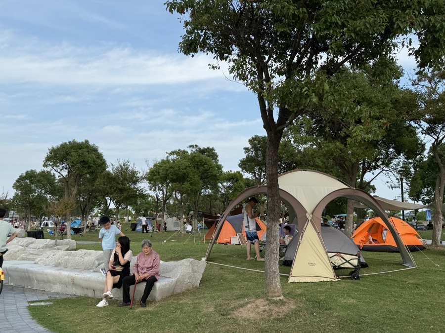今天下午,记者在现场看到,滴水湖环湖核心区域处处是“人从众”的惬意景象:草坪上支起了一顶顶帐篷,家庭露营其乐融融;湖畔步道上,散步、慢跑的市民络绎不绝;儿童乐园里充满了孩子们的欢声笑语;不少家庭选择租用观光脚踏车,悠闲地环湖游览;还有众多游客在精心布置的国庆主题装置前,挥舞着手中的国旗合影留念;滴水湖面上,还有不少划桨板、坐着帆船、摩托艇的畅快身影。