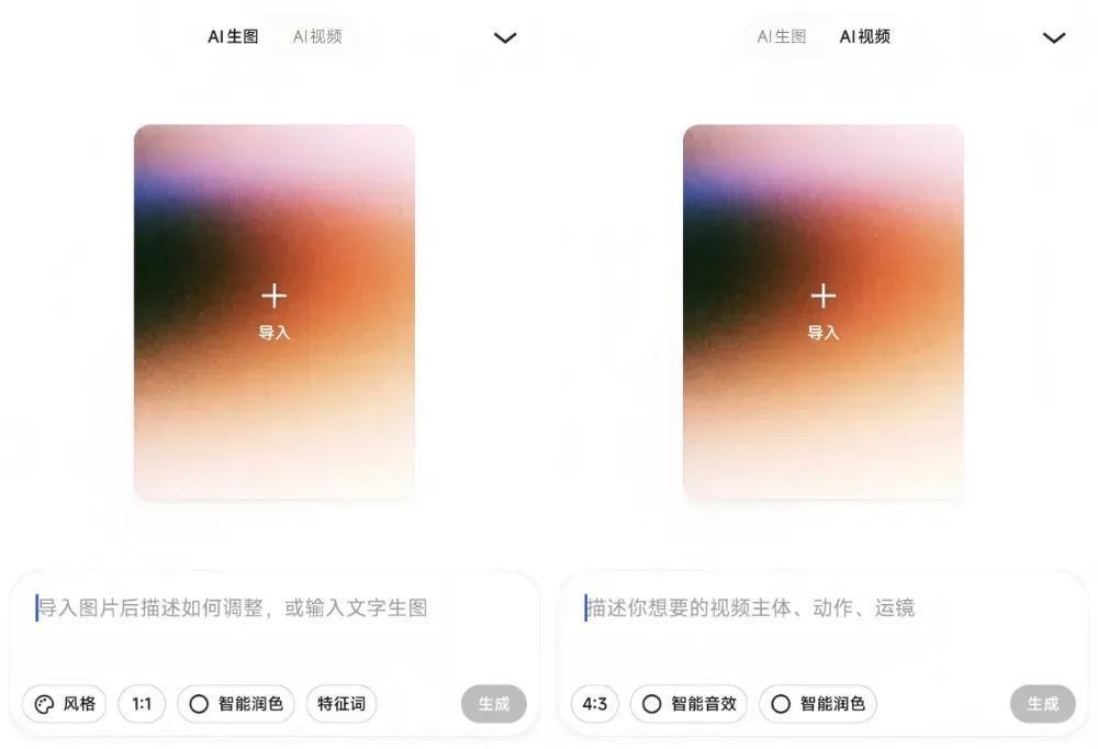 具体到AI创作功能上,用户可在“创作”页面通过点击切换“AI生图”和“AI视频”模式。