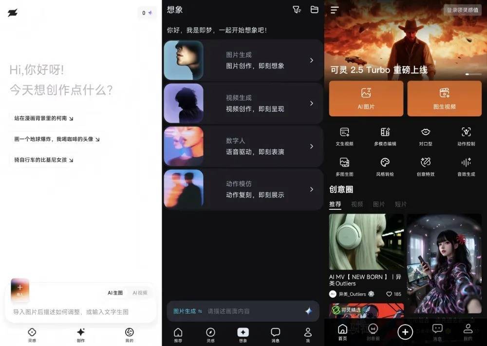 在产品设计上,造点AI采用极简风格,界面非常简洁,即梦相对适中,可灵界面较为繁杂。同时,三款应用均主要分为三大模块,即AI创作、我的和灵感(可灵该功能名为创意圈)。
