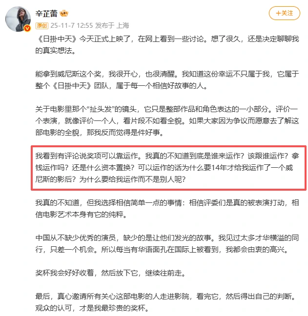 说今年的威尼斯影后也是水来的,靠扯头发拿奖。