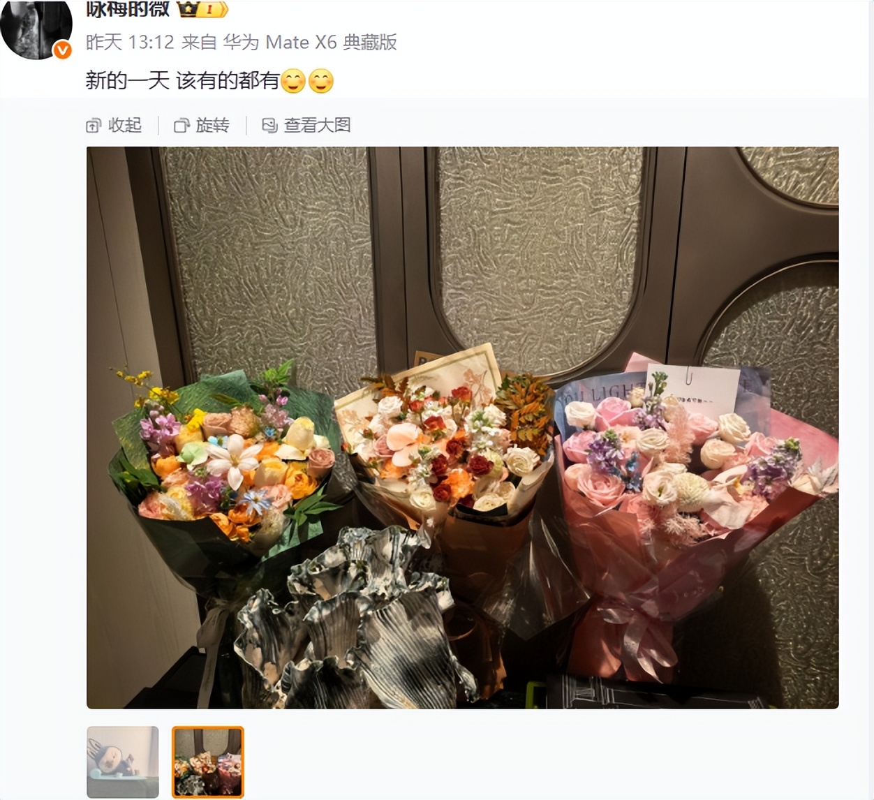 就在11月16日的时候,她发了一条微博,配文很简单,只是说了一句:新的一天 该有的都会有。